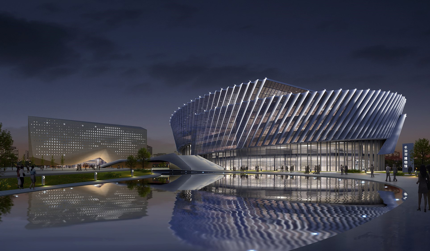 长治三馆项目由方形造型的博物馆和圆形造型的图 书馆/档案馆组成,照明设计对两栋建筑分别定义了 不同的光影表现手法与主题,通过方与圆、山与水、 动与静等富有对比感画面感的融合手法构成一幅山 水相依、光影相映之画。