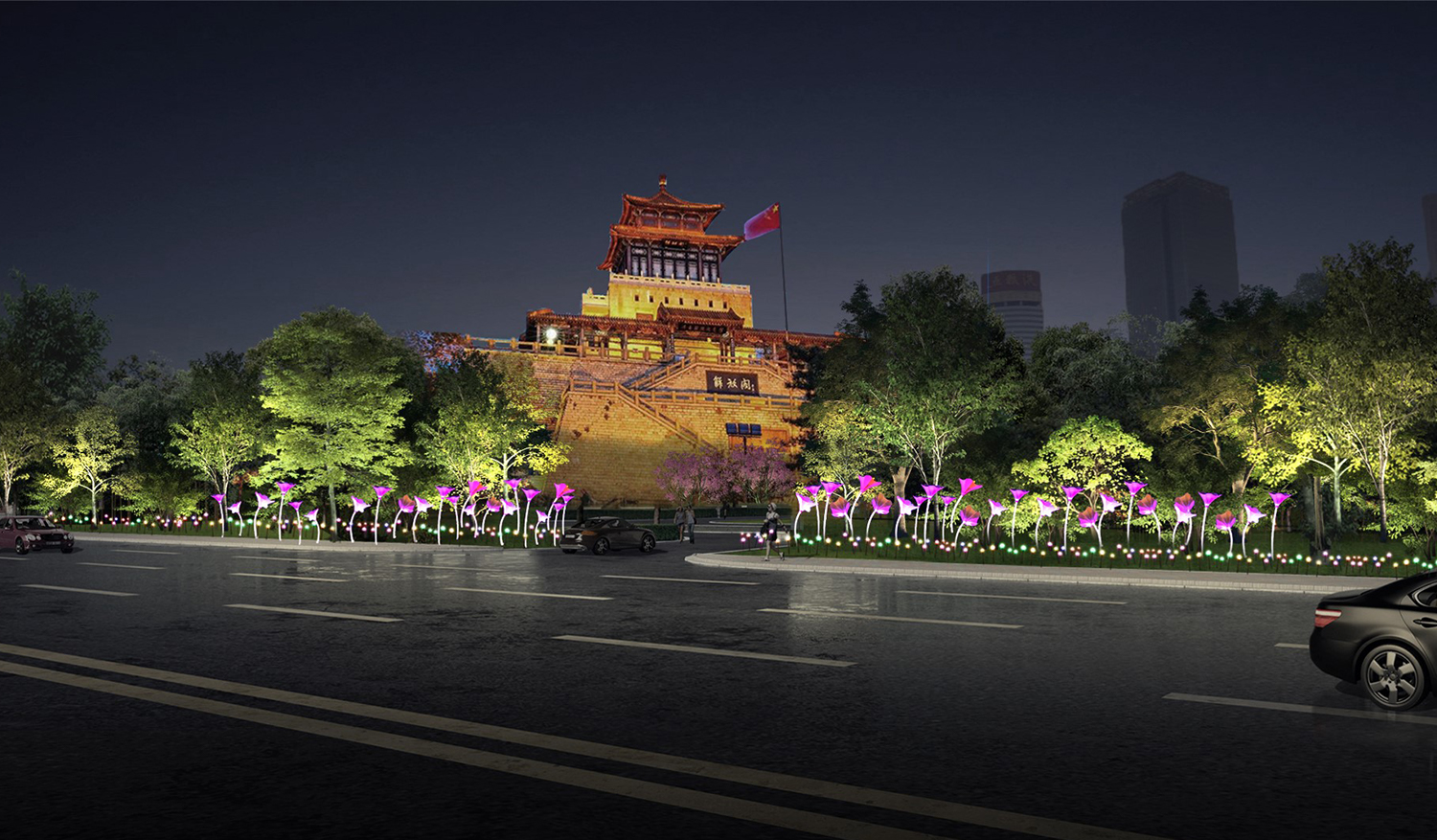 经十路作为济南的城市主干路,代表济南的城市名 片,突出济南发展的活力与现代。奥体西路至奥体 东路段内周边分布有商务办公、体育、政务等多类 型业态。照明设计凸显了城市的夜景特色,彰显了 城市的形象,烘托济南的亲切、宜人、优雅的气质, 使城市具有更强的时代感,充分表现城市环境文化 信息及其建筑美学。