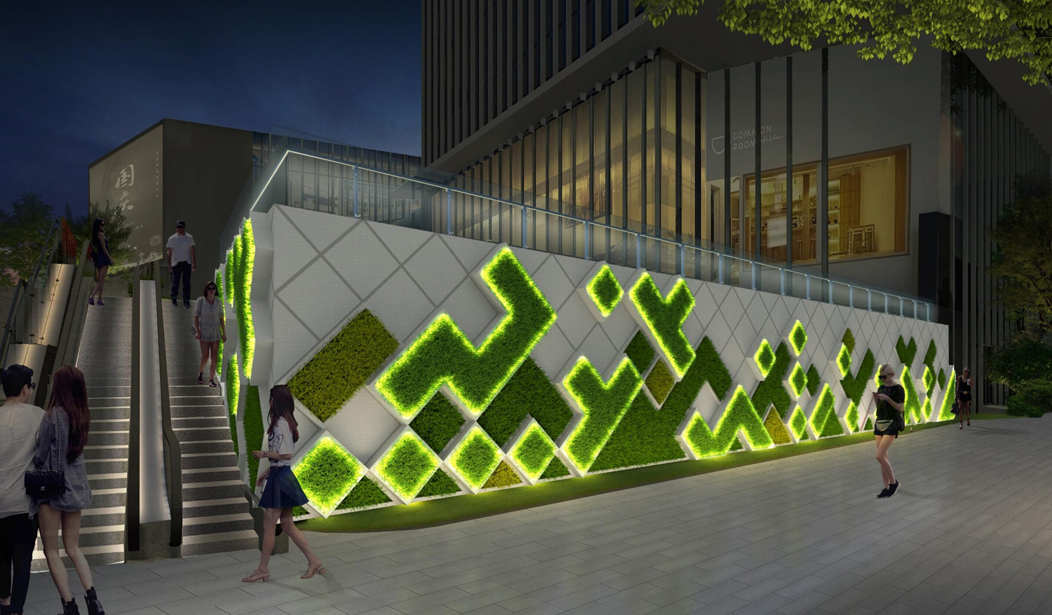 景观设计概念以“山水相映”为出发点, 形成建筑语言中“山”的倒影,体现山水、 动态的抽闲美感。灯光则从细节入手, 希望表达亲近、和谐、互动的光环境情 绪,在重要入口位置重点打造景墙灯光, 达到吸引人流的目的。