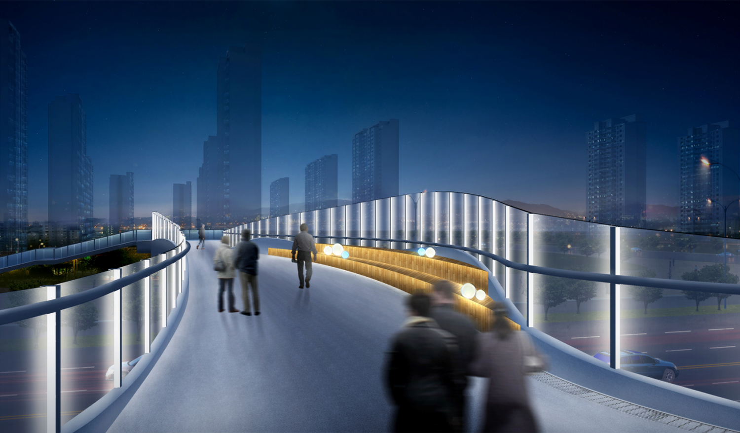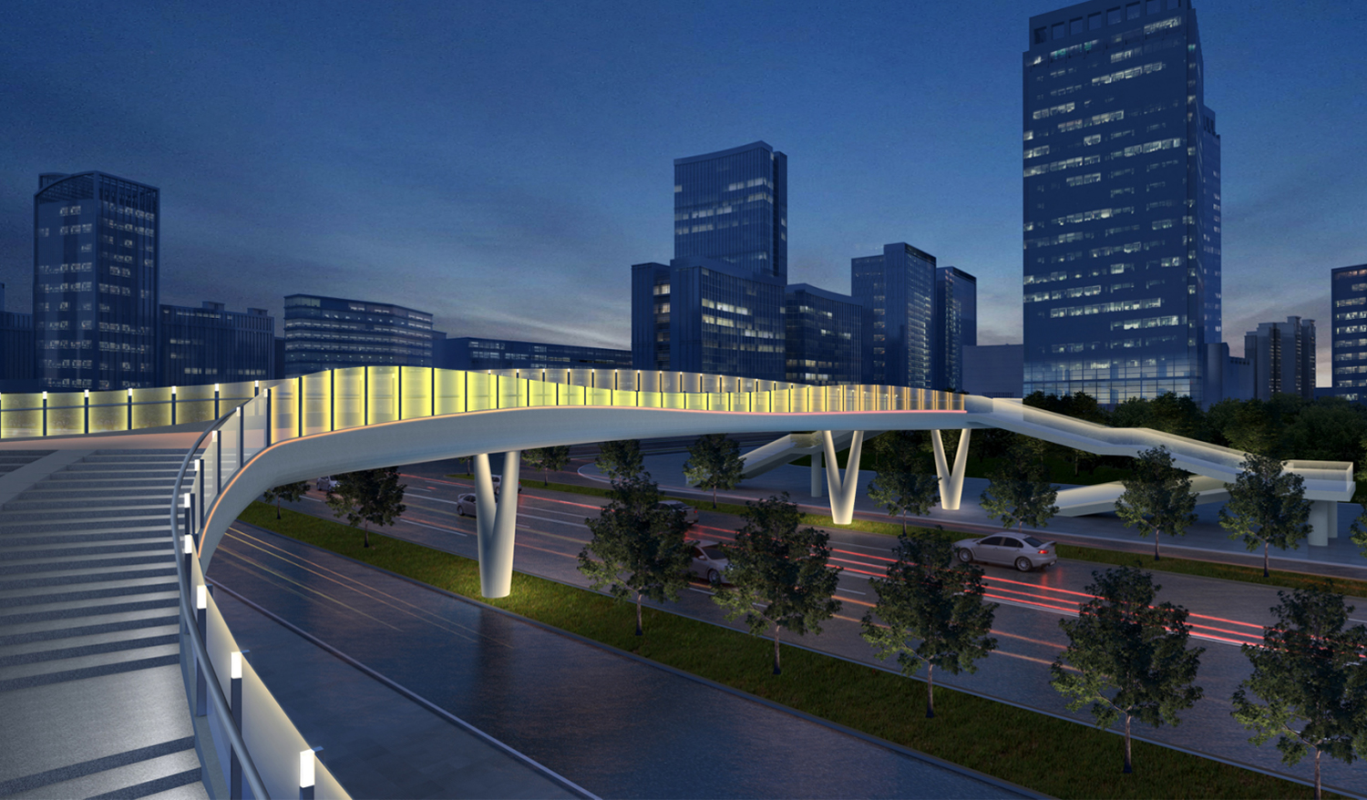 政务天桥S型曲线流动元素,诠释城市纽带 作用,设计力求优美、高品位的灯光视觉 感,照明融入桥体,实现一体化的简洁。 起伏的线条和彩色光电玻璃的设计勾勒出 一个漂浮在城市中的彩带效果,彩色光电 玻璃开启流动效果,行人穿越天桥时,带 给人们无限的遐想。桥面扶手灯提供功能 性照明需求,休闲座椅增加球形灯光小品 灯具,提供照明的同时增强与人的情感互 动。
